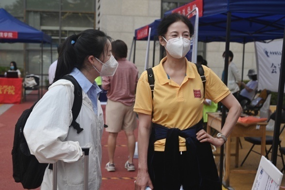 早上八点,研究生新生们陆续来到报到现场。负责迎新的同学们各司其职,帮助新生们迅速依次完成线上报到和照片上传、录取通知书和证件核验、报到材料领取,并向新生讲解注意事项。除此之外,帮忙搬运行李的志愿者也随时待命,每当看到提着行李的新生走近,他们都会主动上前接过行李,并帮忙搬到宿舍。报到现场有条不紊,高效进行。