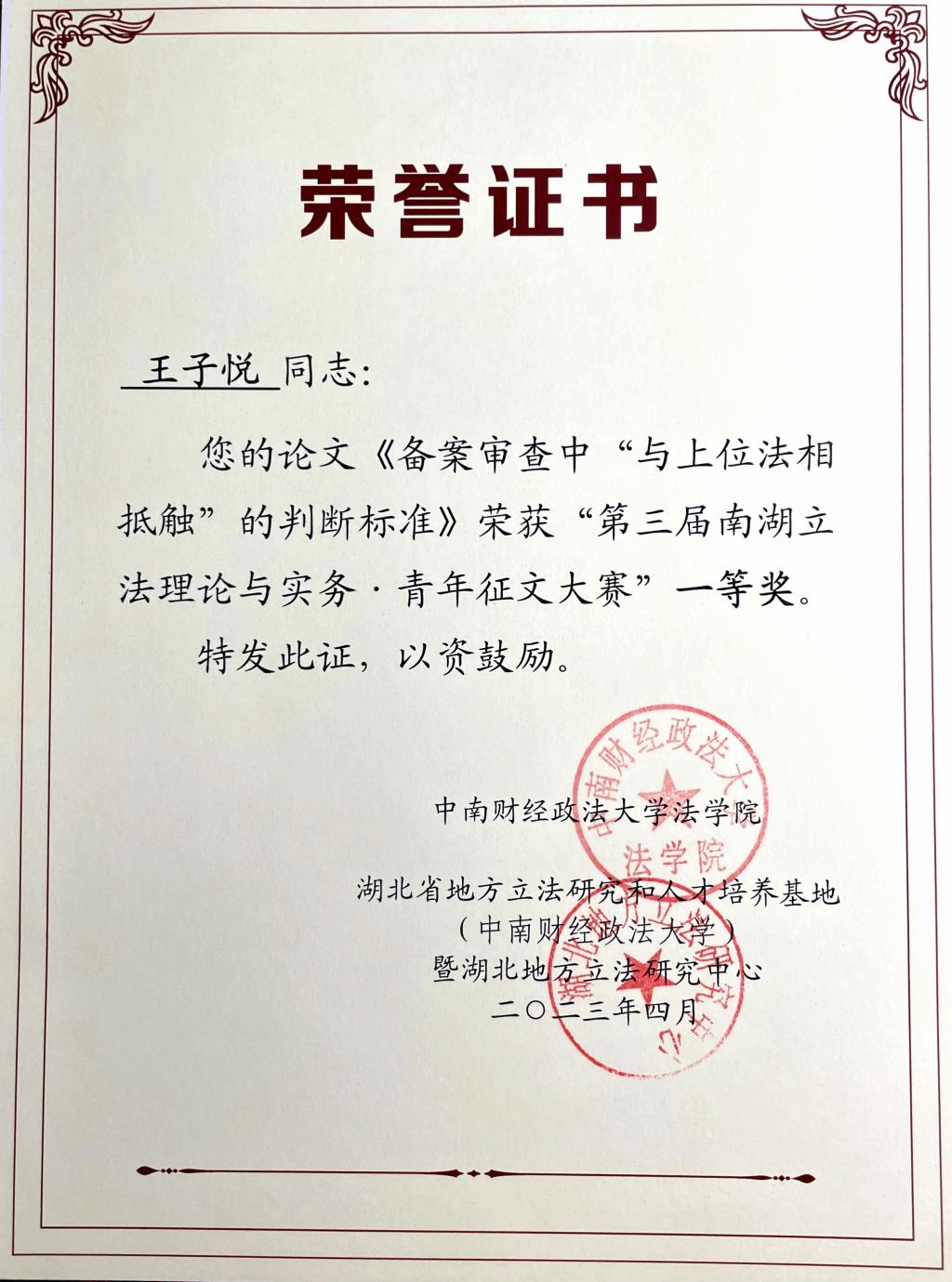 2023年4月8日,中南财经政法大学tyc122cc太阳成集团、湖北省法学会地方立法研究会、湖北地方立法研究中心、湖北省地方立法研究和人才培养基地(中南财经政法大学)、中南财经政法大学人民代表大会制度研究所、《当代立法理论与实务研究》编辑部共同主办的第三届“地方立法理论与实务南湖论坛暨加强新时代立法学教育和理论研究研讨会”在武汉召开。公司2022级博士生王子悦、2021级法律硕士生廖嘉林应邀参加论坛,分获一等奖、二等奖。