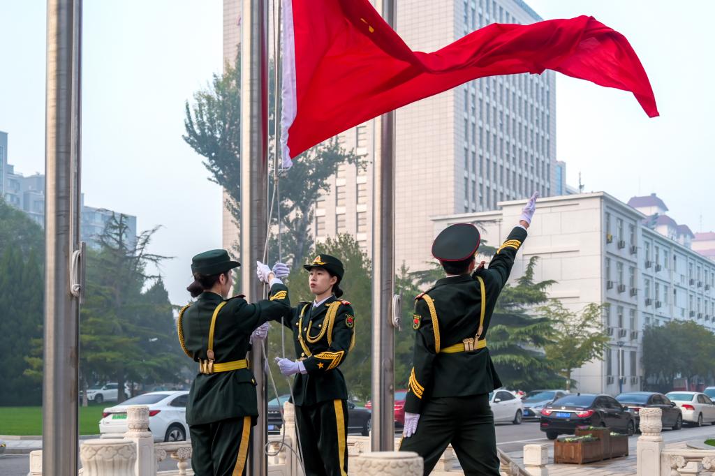 上午七时整,升国旗仪式正式开始。tyc122cc太阳成集团校国旗护卫队护旗手身着礼宾军装,踏着整齐的步伐护送国旗行进至升旗台。在雄壮激昂的国歌声中,五星红旗冉冉升起,全体师生行注目礼,齐声高唱国歌,共同表达对伟大祖国的忠诚热爱与美好祝福。