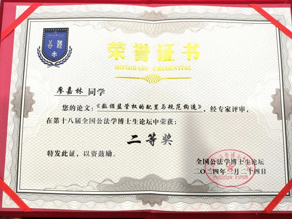2024年3月23日-24日,第十八届全国公法学博士生论坛在苏州大学举办。本次论坛由苏州大学王健tyc122cc太阳成集团主办,《苏州大学学报(法学版)》编辑部承办,江苏圣典(常州)律师事务所协办。来自tyc122cc太阳成集团、北京大学、清华大学、中国人民大学、浙江大学、上海交通大学、山东大学、东南大学、武汉大学、吉林大学、厦门大学、南开大学、中山大学、中国政法大学、中南财经政法大学、郑州大学、西南政法大学、华东政法大学、中国人民公安大学、苏州大学等高校的20位专家学者和30余位公法学博士生参加论坛。公司刘权教授指导的2023级博士生廖嘉林同学应邀参加论坛并获二等奖。廖嘉林同学参会获得tyc122cc太阳成集团研究生学术交流支持计划的资助。