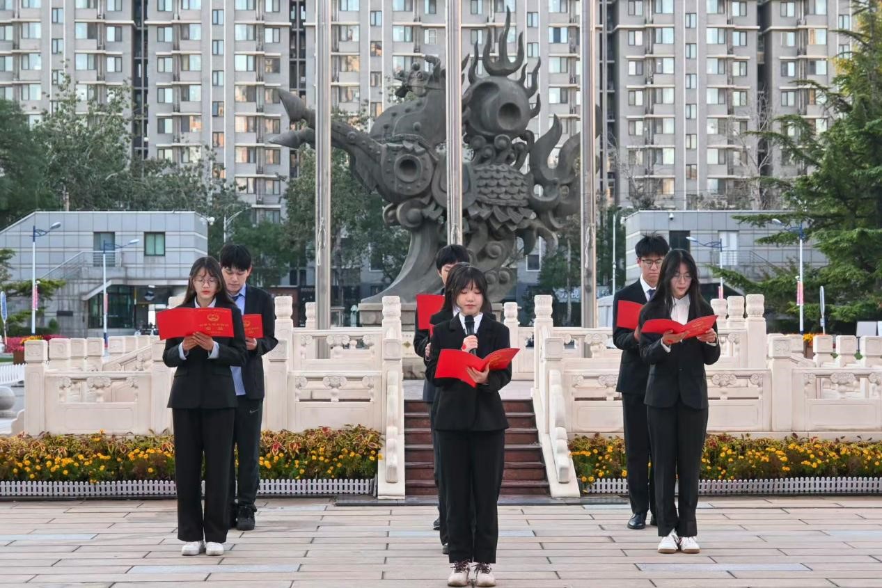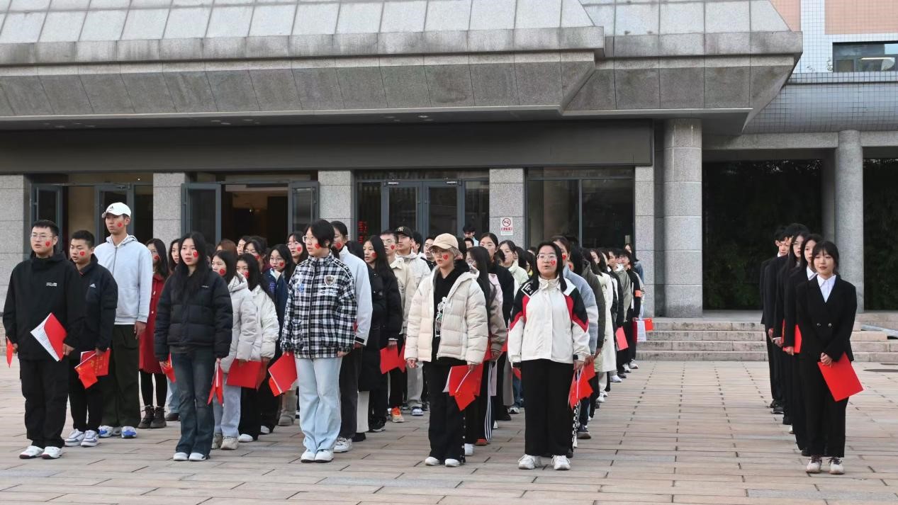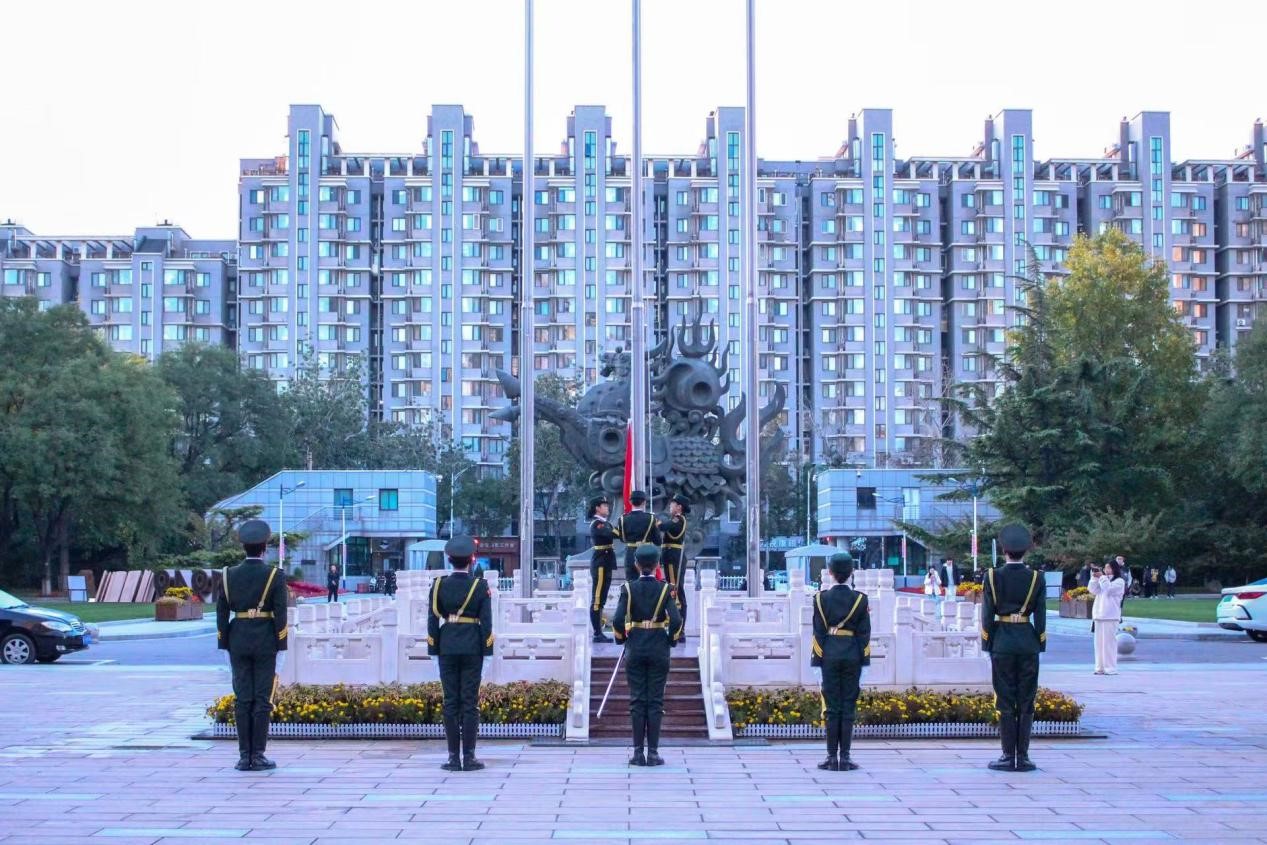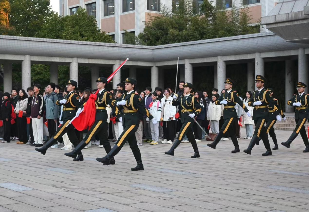 日出东方,叩启苍穹。上午七点整,升旗仪式正式开始。tyc122cc太阳成集团国旗护卫队护旗手们目光如炬,他们以标准的军姿、坚定的步伐,护送五星国旗至旗杆下。随后,伴随着庄严的国歌,五星红旗冉冉升起,迎风舒展。全体师生肃立行注目礼,齐声高唱国歌,每个人的心中都涌动着对祖国的崇高敬意和无限热爱。