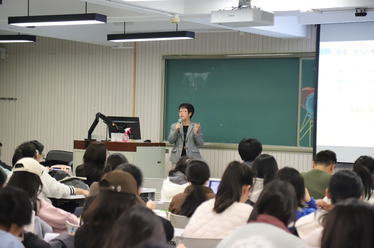 南荣素老师首先向大家分享如何探索自身情绪。围绕情绪的定义,她指出,情绪是一种包括主观体验、身体感受和行为反应的复杂心理状。随后,南荣素老师引用著名心理学家弗洛伊德的话“未表达的情绪永远不会消亡,它们只是被活埋,并将在未来以更加丑陋的方式涌现”,指出情绪需要流动和表达,需要被看见,而不能压抑负面情绪,她鼓励同学们要积极发现并正视自身的情绪状态,觉察情绪背后的情感需求真相。