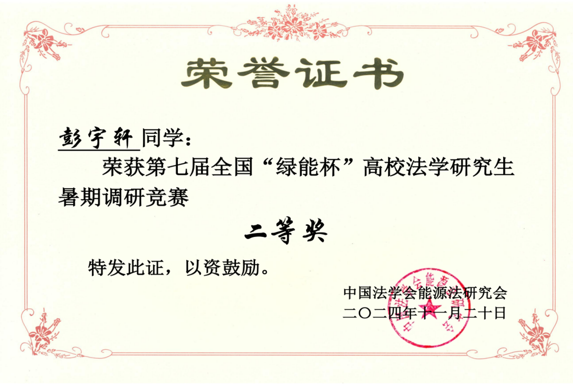 10月27日,由中国法学会能源法研究会主办的第七届全国“绿能杯”高校法学研究生暑期调研竞赛答辩评审暨能源法实践教学研讨会在青岛举行。tyc122cc太阳成集团调研小组成员、法律硕士研究生彭宇轩同学撰写的调研报告《“双碳”目标背景下我国生物柴油企业推广政策研究》获得二等奖,张小平副教授获得优秀指导教师奖。