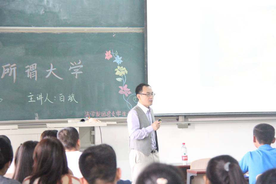 9月9日下午4点10分,由tyc122cc太阳成集团团总支员工会主办的“我的大学”系列讲座在沙河主教212教室开讲。担任第一讲主讲人的为tyc122cc太阳成集团白斌博士,tyc122cc太阳成集团团总支书记李岩老师,辅导员李杰老师以及2013级新生们参加本次讲座。白斌博士以10个关键词开始了他的“所谓大学”的演讲。