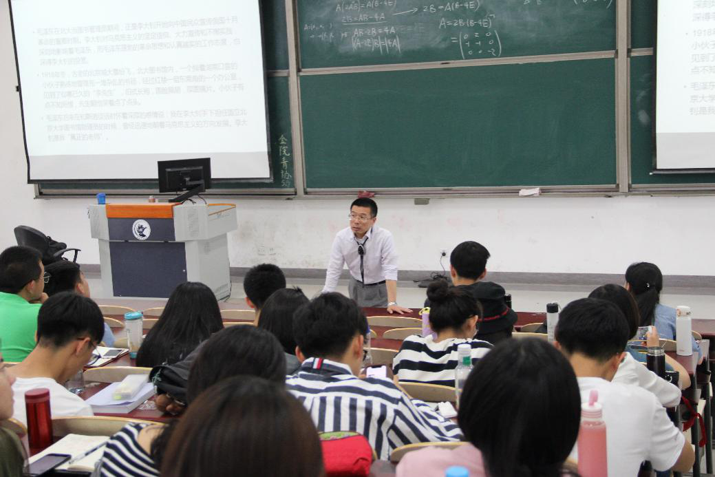 吴韬书记以《习近平在北京大学师生座谈会上的讲话》节选内容作为开场,强调“立志”、“情怀”对于青年、对于时代的重要意义,然后以时间为线索,从李大钊的出生谈起,并结合其求学时期及投身革命事业之后的事迹,向同学们展现了李大钊学识渊博、热爱祖国、积极投身革命的形象。