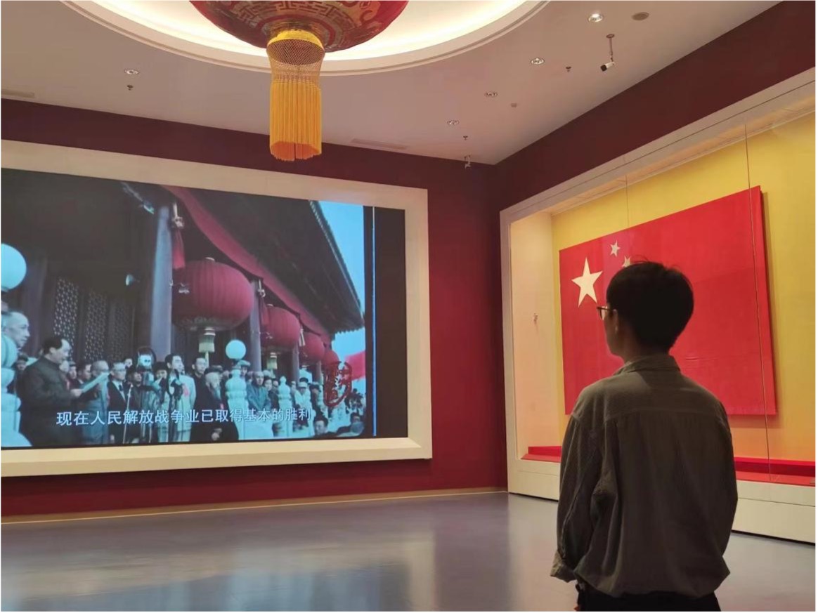进入展厅,各成员按照通史顺序,沿着中国共产党百年来辉煌奋斗的历程脉络参观。从中国共产党的建立与夺取新民主主义革命伟大胜利,到中华人民共和国成立与进行社会主义革命建设,再到改革开放、开创发展中国特色社会主义,最后到进入新时代、全面建设成小康社会与开启全面建设社会主义现代化国家的新征程,展厅陈列出上千幅图画和文字展品。沉浸在如此环境下,参观者耳濡目染,得以近距离参视文物,观摩学习,仿佛置身真实的红色历史当中。