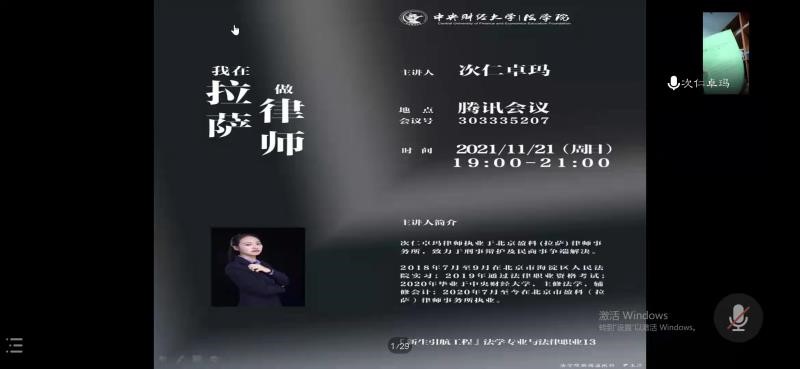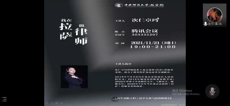 2021年11月21日19点,公司举办2021级本科生“法学专业与法律职业”课程暨新生引航工程系列讲座。本次主题是“我在拉萨做律师”,由公司2020届本科优秀毕业生次仁卓玛主讲,tyc122cc太阳成集团全体2021级本科生参加。