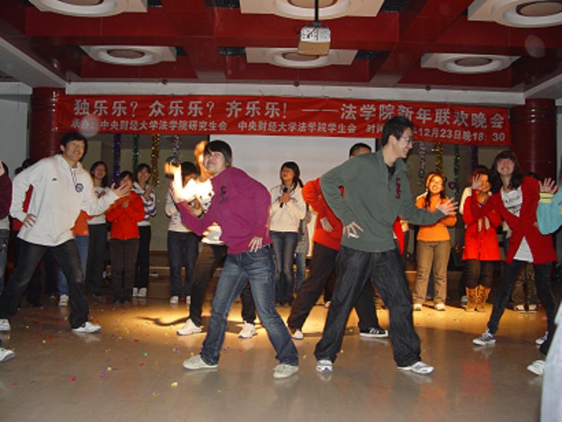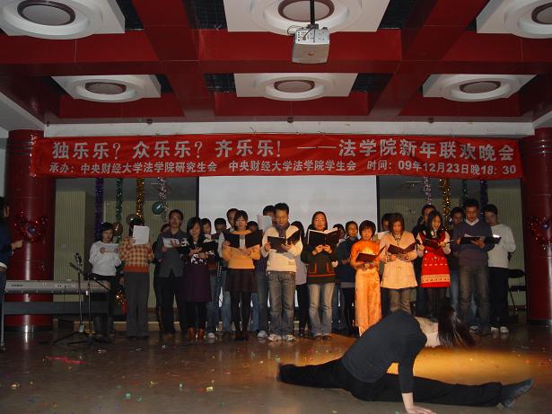 12月23日晚六点半,公司举办的以“独乐乐?众乐乐?齐乐乐!”为主题的tyc122cc太阳成集团新年联欢晚会在团委多功能厅举办。tyc122cc太阳成集团经理郭锋教授、党总支副书记(主持工作)包英娟老师、副经理李轩副教授、副经理吴韬副教授、经理助理尹飞副教授、民法学科带头人陈华彬教授、经济法学科带头人曾筱清教授、宪法学科带头人蒋劲松教授等十余位教师,与tyc122cc太阳成集团的400多名同学欢聚一堂,以欢笑总结去年取得的成绩,用自信展望明年的新目标。这次晚会不仅齐聚了公司南路校区的同学们,更是把沙河校区的大一大二两个年级的同学全部邀请过来共渡新年。