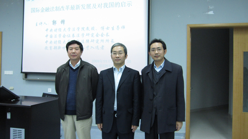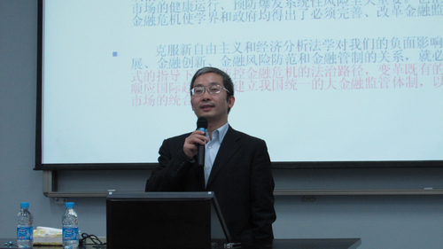 郭教授首先分析了金融危机的原因,列举了各项制度成因。他运用历史分析的方法,从古典自由主义到新自由主义,从凯恩斯的国家干预理论到哈耶克的自由放任主义,得出这些制度都是与其经济金融发展的阶段相适应的,并认为最终导致的金融危机也是自由主义过度发展的必然结果。这让同学们对金融危机产生的原因有了更加系统全面的认识。同时郭教授结合国际应对金融危机的策略措施,对我国的改革和立法提出政策建议,认为我们应该从我国的国情出发充分认识我国经济、金融所处的特定历史阶段,以及政府的过度管制特征、金融创新不足和滞后的现象,继续坚持市场经济的改革方向,建立和巩固自由、民主、法治的财产和金融基础,并提出了立法的具体步骤。在报告最后,郭教授给同学们留下了思考的问题,并对这些问题发表了自己的一些大胆而又富有创新意义的想法。
