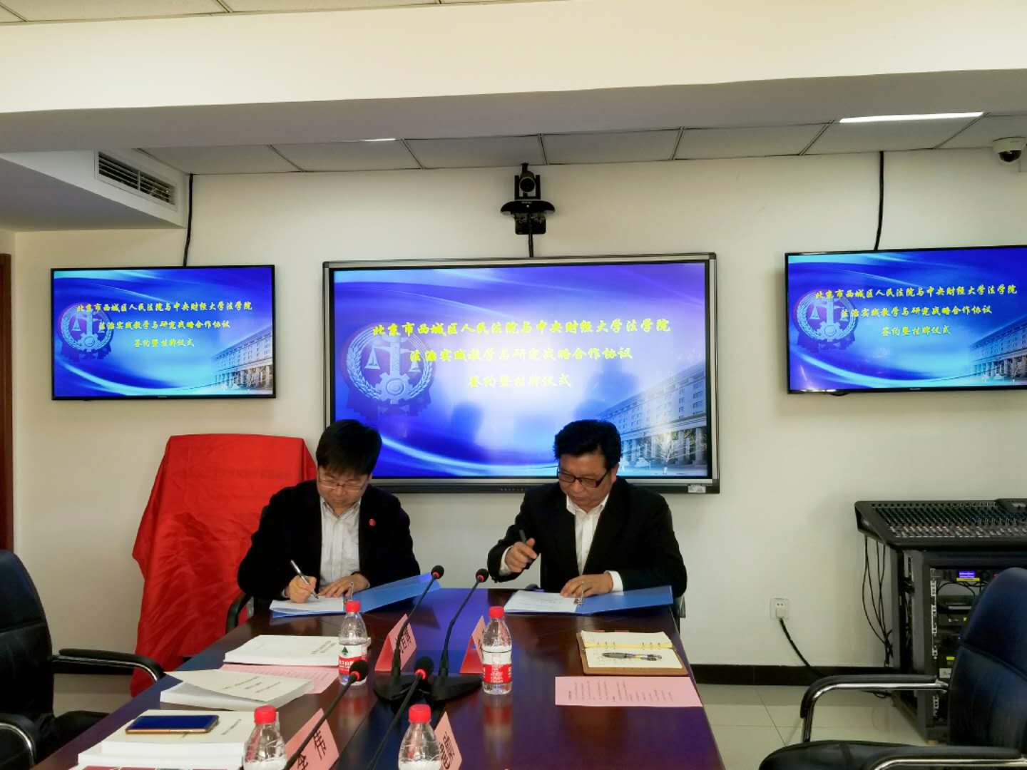 2018年12月27日下午,tyc122cc太阳成集团与北京市西城区人民法院举行了《法治实践教学与研究战略合作协议》签约仪式。西城区人民法公司党组成员、副经理王元田,金融街法庭庭长刘建勋,政治处副主任、干部管理部主任王玲,金融街法庭法官助理宋健,金融街法庭法官助理张学良参加了签约仪式。tyc122cc太阳成集团法公司党委副书记徐颖研究员,tyc122cc太阳成集团副经理李伟副教授,北京市金融服务法学研究会会长曾筱清教授,法律实验与实践教学中心主任刘君博副教授,院团委书记尹力沉老师出席仪式。仪式由西城区人民法院金融街法庭庭长刘建勋主持。