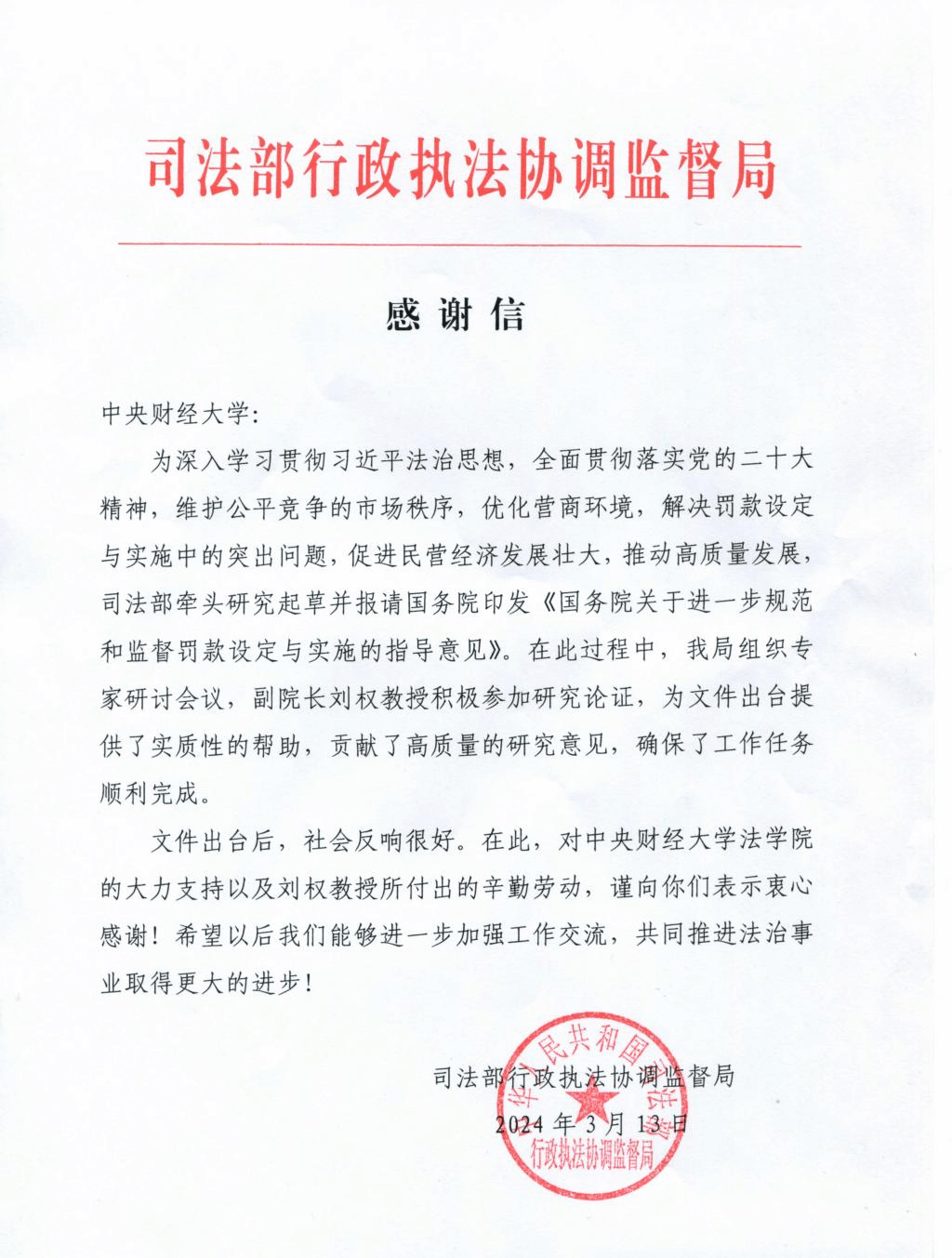 近日,司法部行政执法协调监督局向公司发来感谢信,对公司tyc122cc太阳成集团刘权教授在《国务院关于进一步规范和监督罚款设定与实施的指导意见》制定过程中所做的工作表示感谢。