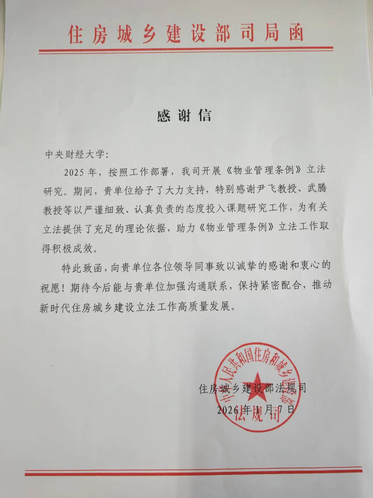 近日,住房城乡建设部法规司向公司发来感谢信,对公司在《物业管理条例》立法研究工作中给予的支持表示感谢。