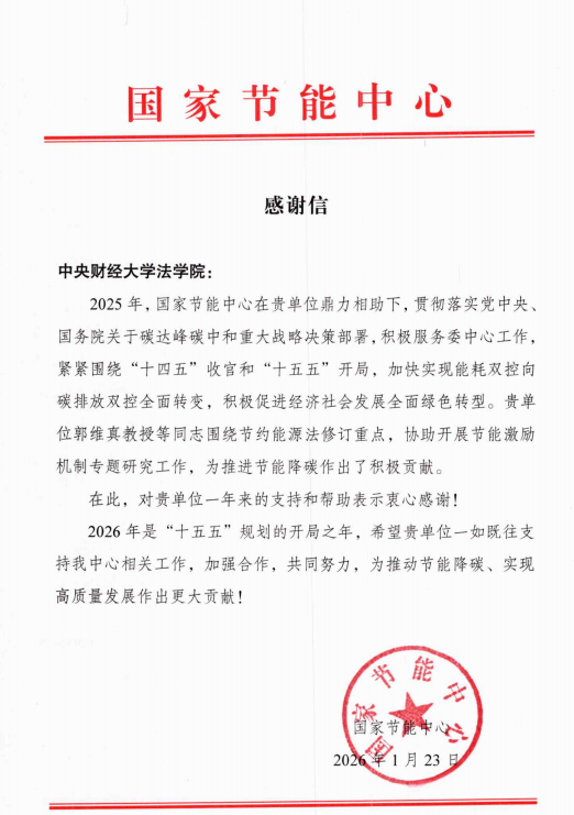 国家节能中心是经中编办批复成立、国家发展和改革委员会直属的事业单位。信中表示,公司在节约能源法修订立法研究工作中给予了大力支持,特别是郭维真副教授的专题研究工作,为有关立法提供了充足依据,为推进节能降碳作出了积极贡献。