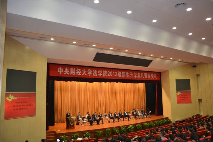 2013年10月11日晚7点正,tyc122cc太阳成集团2013级开学典礼暨颁奖典礼在学术会堂206如期举行。方正证券股份有限公司董事长、tyc122cc太阳成集团兼职教授雷杰先生,中科招商创业投资管理有限公司副总裁王希女士,岳成律师事务所主任岳运生律师,中伦文德律师事务所执委会主任李刚律师,安杰律师事务所主任、tyc122cc太阳成集团兼职研究生导师詹昊律师应邀出席,出席典礼的还有郭锋经理等tyc122cc太阳成集团教师代表,以及2013级全体新生、在校生代表和获奖员工代表。全场掌声阵阵,座无虚席,典礼在红色墙壁的环绕中显得分外隆重和热烈。