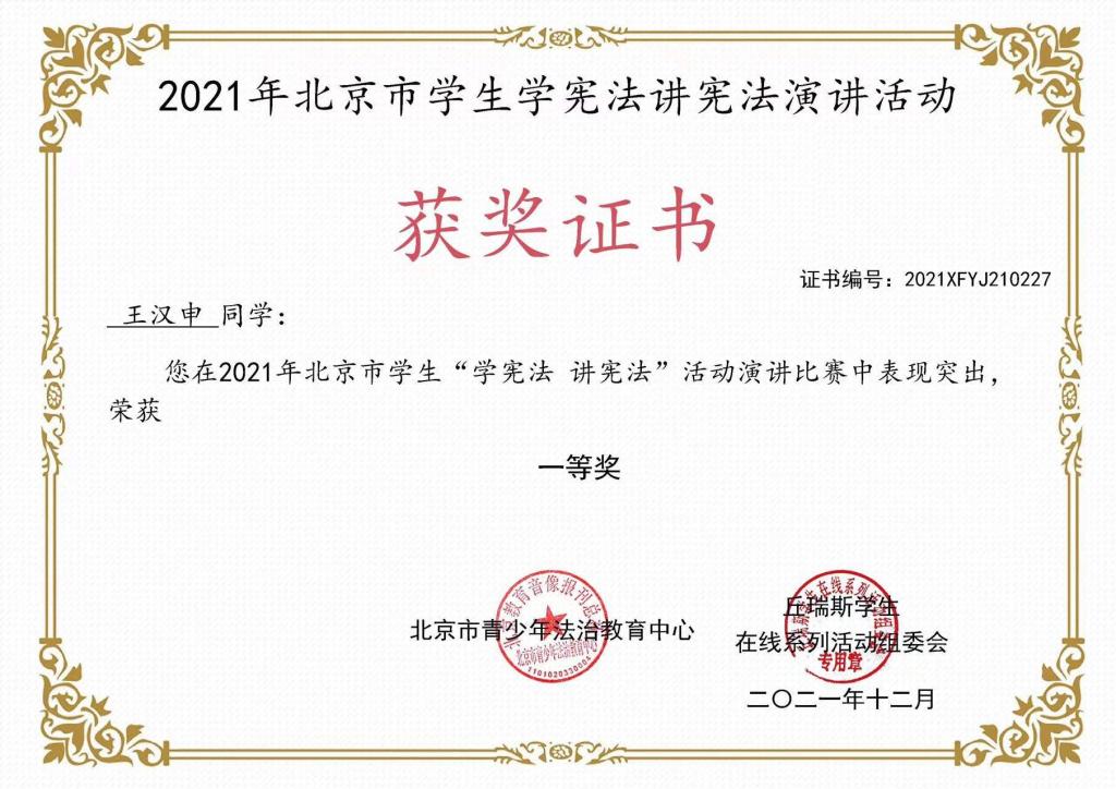 最终,王汉申同学获得了北京市一等奖的好成绩。