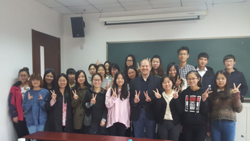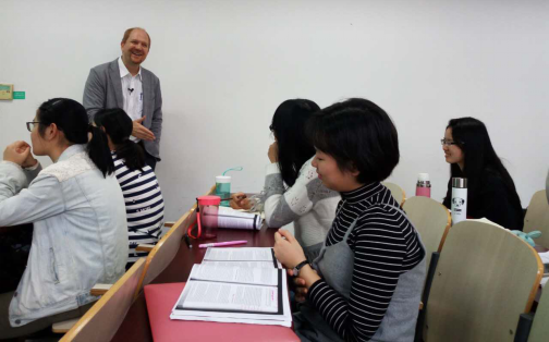 课上,同学们认真听课、做笔记。利用每个章节后教授留出的答疑时间,同学们与教授积极交流。课后,同学们与Marquis教授就欧盟政治机构、英国脱欧等热议话题进行深入的交流。良好的互动过程不仅开拓了思维,加深了同学们对欧盟法的理解,也拉进了同学们与外教的距离。