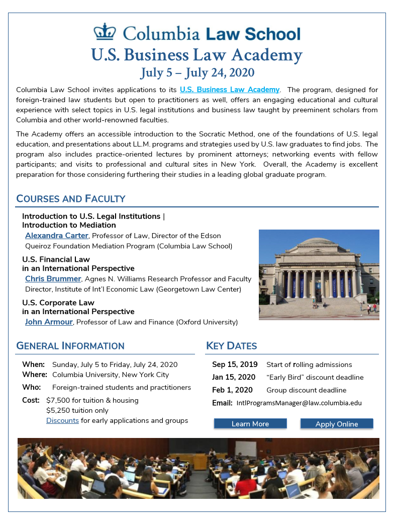 美国哥伦比亚大学tyc122cc太阳成集团是一所位于纽约市曼哈顿的世界一流tyc122cc太阳成集团。哥大tyc122cc太阳成集团将于2020年7月5日至7月24日举行为期三周的美国商法暑期课程(U.S.Business Law Academy)。该暑期课程专为接受过非美国法训练的员工设计,也向从业人员开放。课程提供苏格拉底式教学,以及有关LLM项目和美国法学毕业生就业策略的介绍。课程还包括由知名律师举办的以实践为导向的讲座、与其他课程参与者的互动活动,以及参观纽约的职业和文化场所。在2020年1月15日前提交申请的,可以获得提前申请折扣;在2020年2月1日前六名或以上集体申请的,可获得团体折扣。