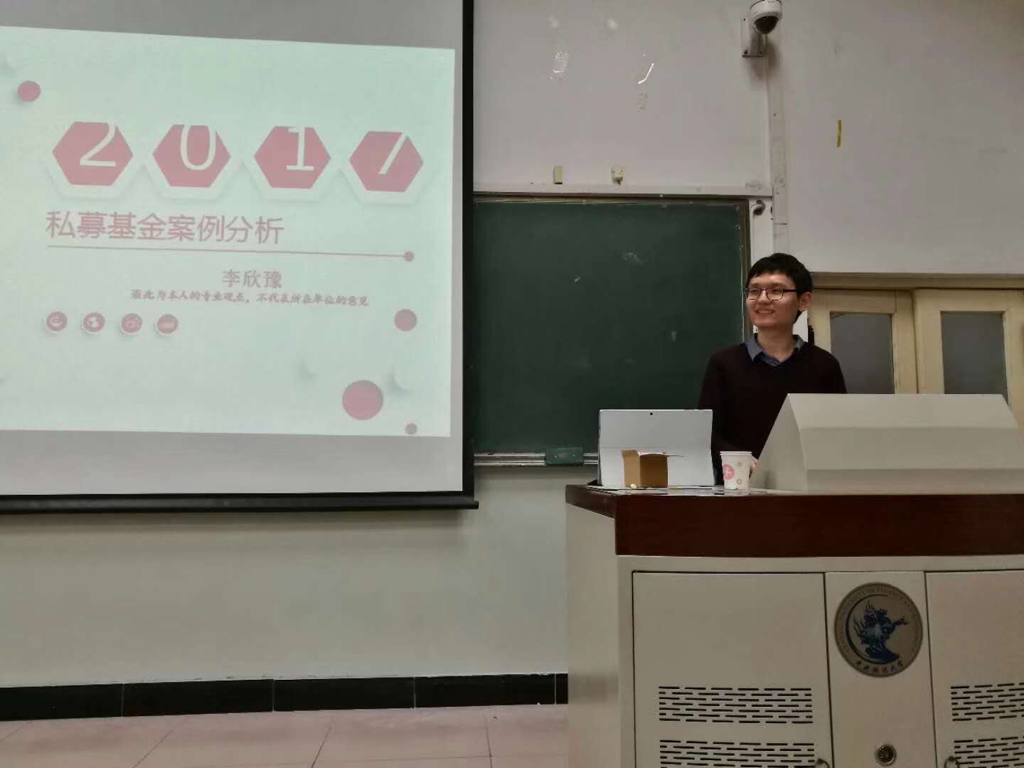 2017年12月20日晚,公司“金融法实务论坛”在公司南路校区主教308教室举行。本次讲座由tyc122cc太阳成集团金融法律风险研究中心承办,公司2012级法律(法学)硕士研究生、中国证券投资基金业协会法律部李欣豫主讲,主题为“私募基金案例分析”。公司邢会强教授、李伟副教授,北京交通大学郑翔副教授以及公司100多名研究生参加本次论坛。公司邢会强教授担任主持人。