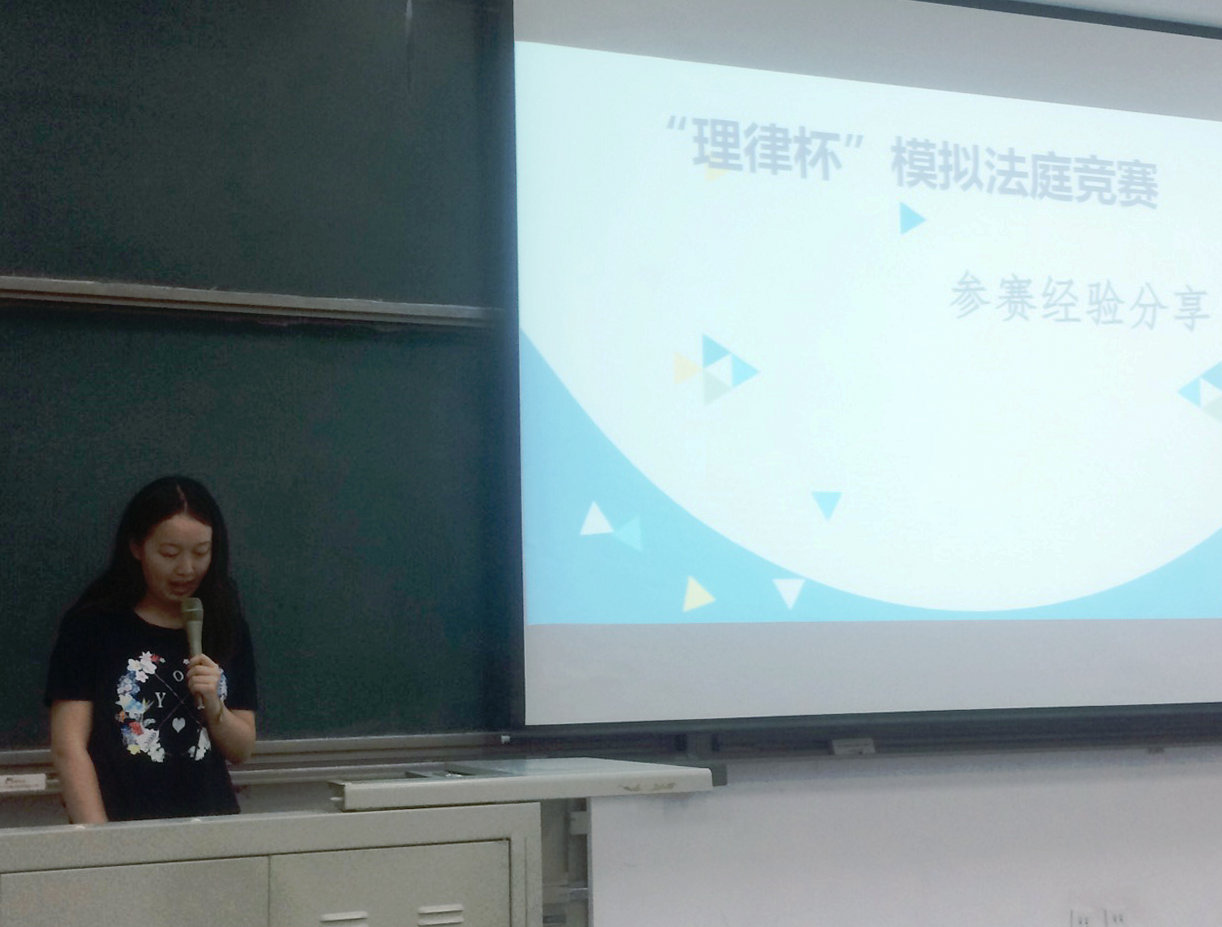 周心怡同学首先向在场的同学们就“理律杯”模拟法庭比赛做了一个简单的介绍,随后通过分享自己参加比赛、准备比赛时的一些真实的照片,使大家对该比赛有了更加生动具体的认识,同时也为参赛队员付出的辛苦和努力而感动。当谈到参加这一比赛的收获时,她提到了两组关键词。一是“有意思”,因为比赛的赛题新颖,而且极具综合性,囊括了很多部门法的知识,队员们也能轻易地从中找到自己最感兴趣的问题。二是“成就感”,通过将近三个月的认真准备、激烈讨论、熬夜写作、反复修改以及在庭辩中的言辞交锋、逻辑对抗,参赛队员对于法律工作所需要的细致和严谨的品质有了更加深刻的认识,同时其自身的综合能力得到了全面的提高,通过比赛亲眼见证了自己的迅速成长和变化。