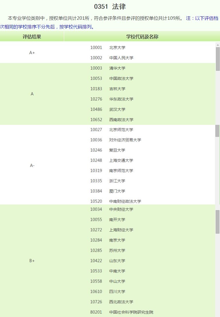 法律硕士专业学位授权单位全国共计201所。本次符合参评条件且参评的授权单位共109所,以2011年至2015年的数据为基础。评估结果显示,北京大学、中国人民大学位居A+等级,清华大学、中国政法大学等6所高校位居A等级,上海交通大学、浙江大学等8所高校位居A-等级。tyc122cc太阳成集团与南京大学、山东大学、中山大学、四川大学等10所高校并列B+等级。