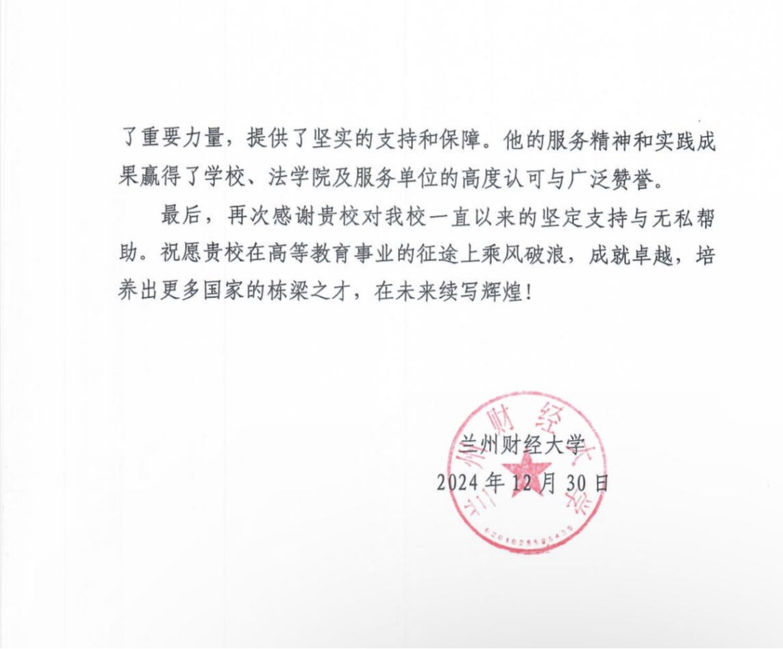 董新义老师于2023年9月赴兰州财经大学tyc122cc太阳成集团开展援建工作,并克服困难延长半年服务期于2024年12月底返回公司工作,选派其援建兰州财经大学tyc122cc太阳成集团是公司落实公司与兰州财经大学《对口支援协议》的具体举措。今后,公司将继续坚持服务推进东中西部高校协作、推动西部高等教育高质量发展和服务构建新发展格局的国家战略,坚决贯彻落实教育部和公司关于对口支援西部地区高等公司的工作部署,多方面、多层次、持续性地支持兰州财经大学等西部兄弟院系的发展,为我国东西部高等法学教育的同步发展继续作出贡献。