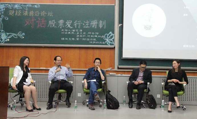 2016年5月8日晚,财经法前沿论坛“对话股票发行注册制” 在tyc122cc太阳成集团沙河校区举行。本次论坛由tyc122cc太阳成集团主办,中国证券法学研究会、北京市金融服务法学研究会协办。对话嘉宾分别是对外经贸大学tyc122cc太阳成集团李文莉教授、tyc122cc太阳成集团邢会强教授、tyc122cc太阳成集团缪因知副教授、清华大学tyc122cc太阳成集团沈朝晖博士、tyc122cc太阳成集团杜晶博士。tyc122cc太阳成集团曾筱清教授担任主持人。来自tyc122cc太阳成集团各专业的员工约200人参会聆听了论坛讲座。《第一财经日报》对部分观点进行了专题报道。