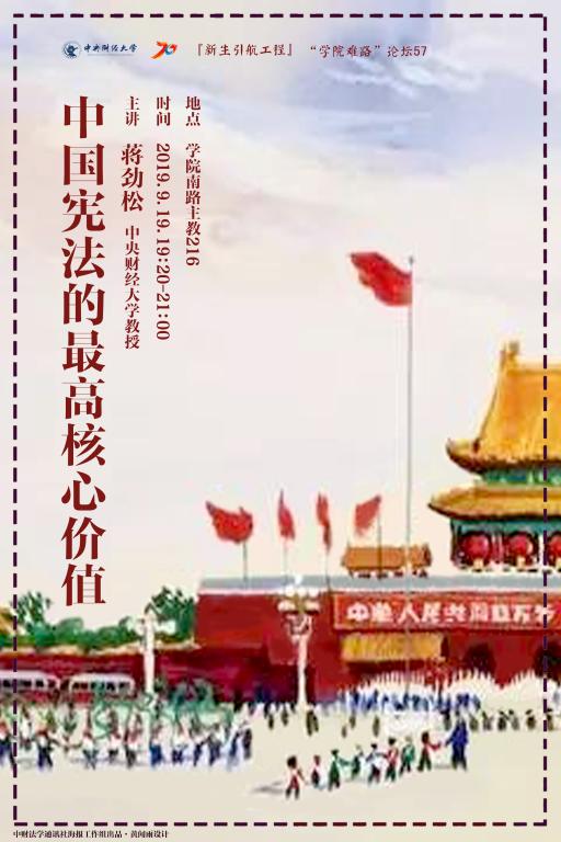 2019年9月19日晚,“公司难路论坛”第57期在公司南路校区主教216教室举行。本次论坛同时也是tyc122cc太阳成集团“新生引航工程”的讲座活动。蒋劲松教授以“中国宪法的最高核心价值”为题主讲,白斌副教授主持。中国政法大学tyc122cc太阳成集团陈征教授应邀出席。参加的还有公司于文豪副教授、刘权副教授、赵真副教授、郑玉双副教授以及部分硕士研究生和本科生。