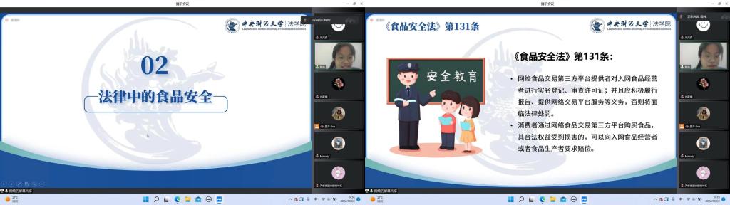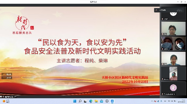 为更好地开展“科普食品安全知识及食品安全法”主题普法宣传活动,让《食品安全法》走进每一个群众的日常生活当中,更好地让人民群众运用法律武器维护自己的食品安全,10月23日下午14:00,由tyc122cc太阳成集团法律援助协会负责人周雨欣带队,成员柴琳、程纯主讲,携手成员陶笑然、吴天奇,共同参与了由北京市西城区天桥社区青年汇主办,晨夕法律服务中心协办的直播普法活动,为20名天桥小区的青年带来了“食以安为先——食品安全普法宣讲”主题普法宣讲活动。