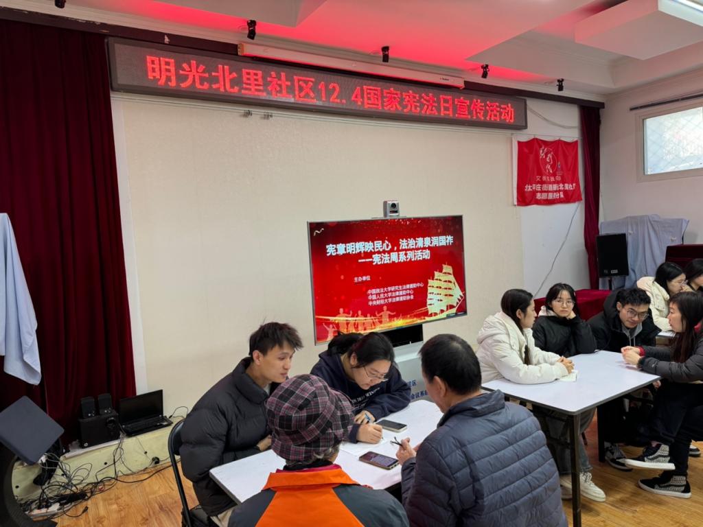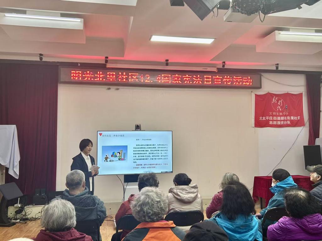 2024年11月26日,由tyc122cc太阳成集团法律援助协会、中国政法大学研究生法律援助中心与中国人民大学法律援助中心合办的“宪章明辉映民心,法治清泉润国祚——宪法周系列活动之明光北里普法宣讲活动”在明光北里社区顺利举行,活动分为普法讲座和法律咨询两个环节,本次活动在海淀区明光北里社区全力支持下成功开展。