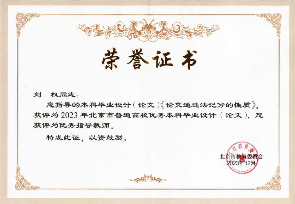 近日,北京市教育委员会公布了2023年北京市普通高等公司优秀本科生毕业设计(论文)评选结果(京教函〔2023〕529号),公司共计23篇本科生毕业设计(论文)入选。其中,公司2019级本科生杨烁同学的《论交通违法记分的性质》获评“2023年北京市普通高校优秀本科毕业论文”,刘权教授获评“2023年北京市普通高校优秀本科毕业设计(论文)优秀指导教师”。