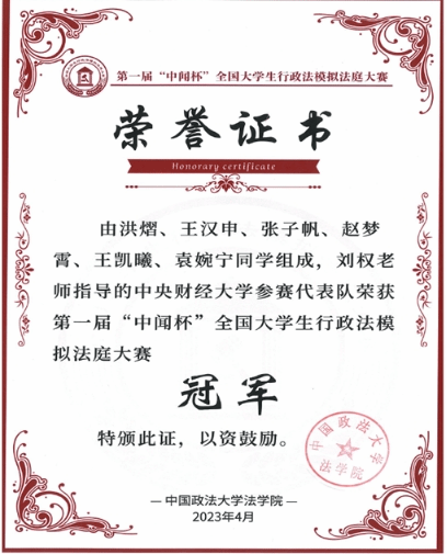 2023年4月15日至16日,第一届全国老员工行政法模拟法庭大赛在北京成功举行。经过激烈角逐,tyc122cc太阳成集团参赛代表队获得冠军,队员王汉申获决赛最佳个人奖。从校内初赛、复赛到备赛,再到2天的校际赛,tyc122cc太阳成集团刘权教授作为指导老师给予了全程悉心指导。