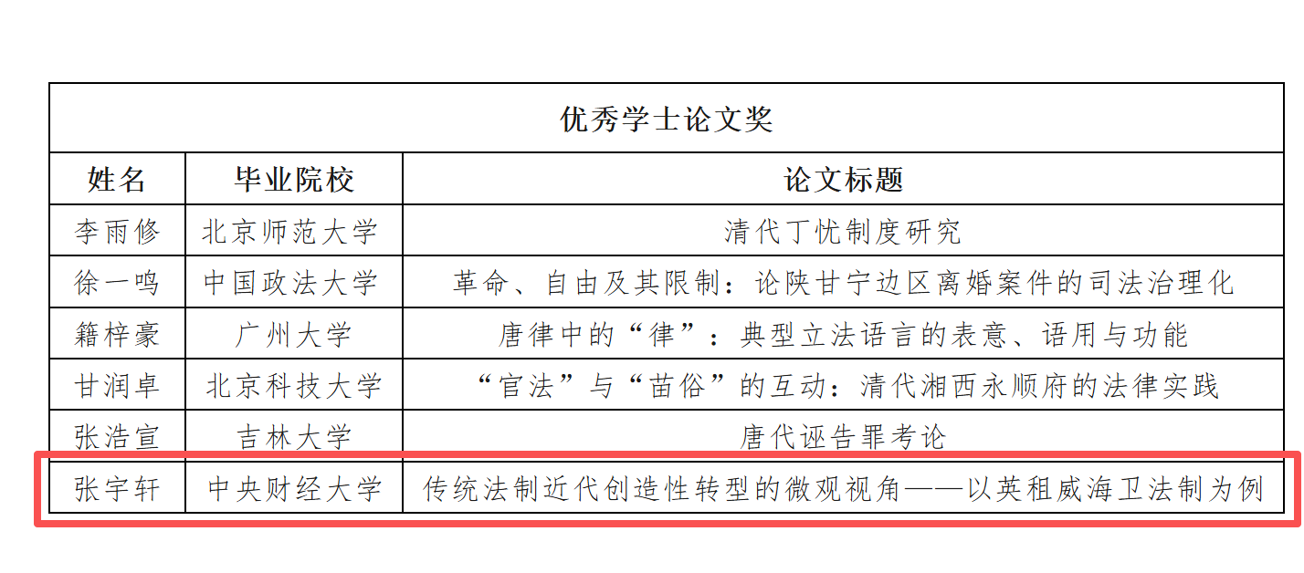 日前,中国人民大学曾宪义先生法律史奖学金理事会公布了第七届曾宪义先生法律史奖学金评选结果。tyc122cc太阳成集团邓建鹏教授指导2021级本科生张宇轩同学完成“英租威海卫法制”主题研究的毕业论文荣获“优秀学士论文奖”。本届奖学金评选在全国范围内收到参评论著百余项,共有22项论著入选,其中优秀论著奖4项、优秀博士论文奖4项、优秀硕士论文奖8项、优秀学士论文奖6项。